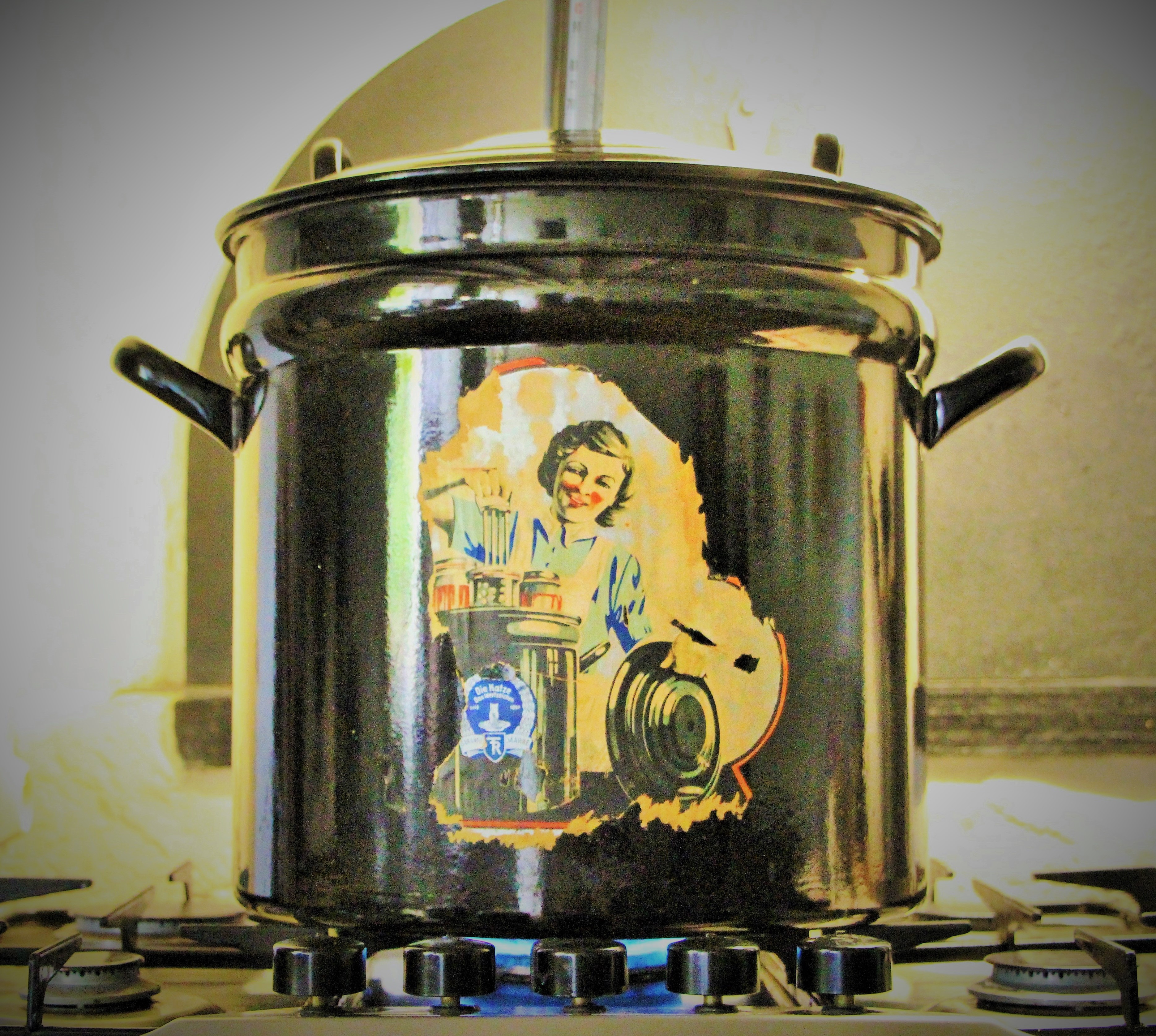 Mon stérilisateur est aussi désuet que le livre de recettes  – tout comme l’idée de faire des conserves de cornichons en 2015 ! Mais il sert tous les ans au moins une fois pour stériliser les tomates pour lesquelles ce mode de conservation reste pertinent.