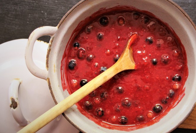 Et puis c’est déjà le tour des framboises de mûrir. Les récoltes quotidiennes me laissent avec des kilos de fruits à mettre au grand-froid pour l’un de mes desserts préférés (recette sous « Trop de …framboises ») et en attendant un moment plus calme pour en faire des confitures. Vient le tour des groseilles. Je n’ai que deux pieds mais ils donnent abondamment vers la mi-juin. J’attend que la majorité des baies soient mûres et je cueille le tout en deux-trois jours et avec l’aide de mon mari (le principal consommateur de gelée de groseille !). Le cassis mûrit à peine un peu plus tard, mais pas aussi uniformément que les groseilles. En conséquence, sa récolte peut s’étaler sur un peu plus de temps.Mais ma baie préférée, c’est la myrtille. Son exigence d’un sol léger et acide ne me permet pas de la cultiver en pleine terre. Pourtant l’année dernière, j’en ai plantée deux buissons dans une très grande bassine avec de la terre de bruyère et du sable mélangés à la terre du jardin. Ils semblent s’y plaire et je commence à avoir une petite récolte de ces jolies billes mates et savoureuses.D’ailleurs, normalement, je ne mettrais pas les myrtilles dans la « Rote Grütze ». « Grütze » veut dire gruau en allemand et évoque la même bouillie peu ragoutante qu’en français. Mais il ne faut pas s’arrêter au son du mot, la Rote Grütze est délicieuse, notamment avec une glace ou une crème à la vanille. Toutefois, je crois que cette recette a été inventée pour y fourrer tous ces fruits rouges dont on ne sait plus quoi faire et qui commencent peut-être à se perdre. D’où ma réticence à y sacrifier mes quelques précieuses myrtilles!