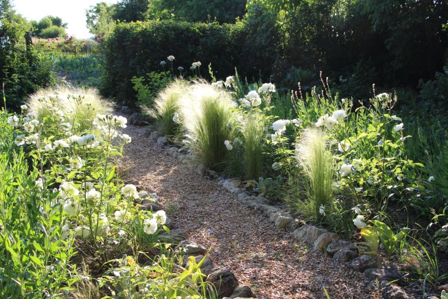 En 2015, la petite allée centrale de mon jardin blanc était un ravissement : le mélange de rosiers ‘Iceberg’, d’oreilles d’ours et de graminées cheveux d’ange s’équilibrait à merveille.