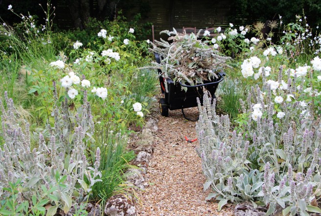 Mais l’année d’après déjà, les oreilles d’ours, ou stachys byzantina, se plaisaient un peu trop et commençaient à étouffer les graminées. L’effet était quand-même encore très beau et je ne me méfiais pas assez des aises qu’avaient prises les douces oreilles. Cette année, en revanche, elles ont carrément pris le pouvoir et je les soupçonne même d’avoir asphyxié mes rosiers qui n’ont pu s’en sortir que par le haut : ils fleurissent au bout de longues tiges dépourvues de feuilles et sont tristes à voir ! Les cheveux d’ange, ou stipa tenuifolia, quant à eux, ont fui le devant de la scène et se sont retirés là où il y avait moins de concurrence.