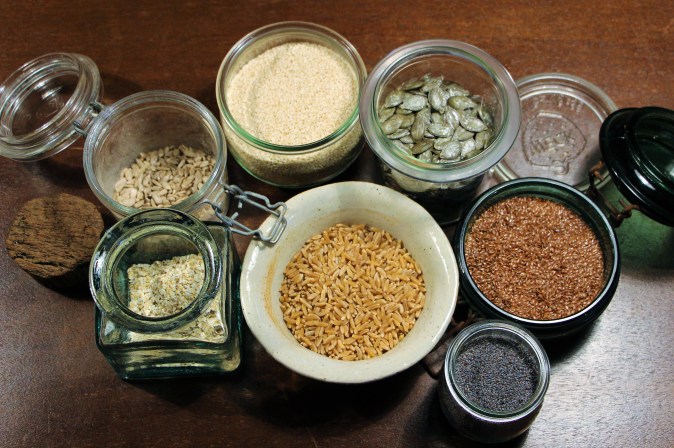Si vous êtes l’heureux propriétaire d’un Thermomix, commencez par moudre les graines d’épeautre ou de blé pendant trente secondes à la vitesse 10. Sinon, mélangez tous les ingrédients dans un grand bol et laissez reposer pendant une heure. (Dans le Thermomix mélangez pendant dix secondes vitesse 4 et à l’envers.)