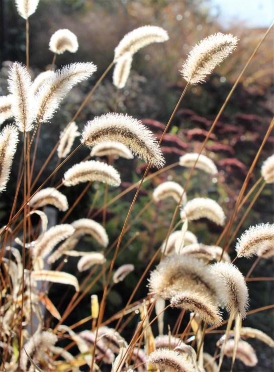 Pourtant à ce moment-là, il restait des couleurs au jardin sec. Les douces plumes de Setaria ‘caramel’ se teintaient de rose et leurs feuilles viraient au lie-de-vin.