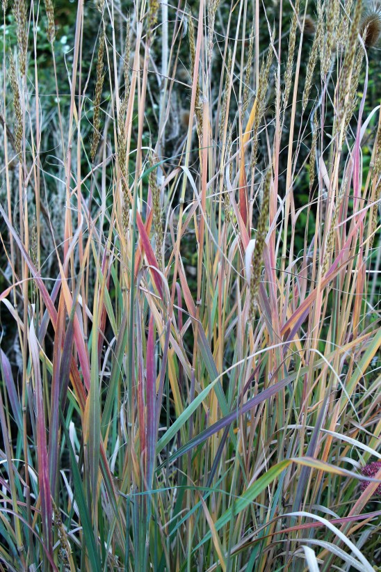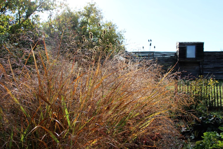 Pourtant à ce moment-là, il restait des couleurs au jardin sec. Les douces plumes de Setaria ‘caramel’ se teintaient de rose et leurs feuilles viraient au lie-de-vin.