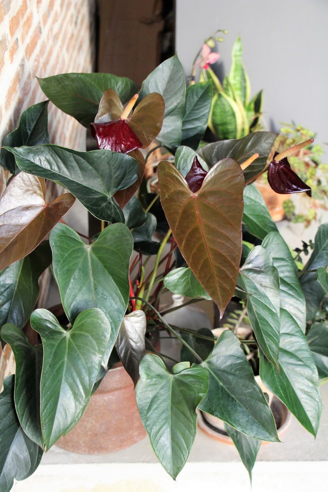 D’habitude, les anthuriums présentent des fleurs d’un rouge primaire pas vraiment à mon goût, mais celui-ci se distingue par ses fleurs couleur aubergine et ses jeunes feuilles marron. Lustrer ces feuilles avec un chiffon humide était une tâche agréable et apaisante.