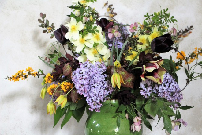 J’ai pris une bonne résolution : plus jamais je ne partirai au mois d’avril ! Après une dizaine de jours passés en Allemagne, où il faisait froid et moche, ici mon jardin a « explosé ». La douceur du printemps a profité aux mauvaises herbes, comme aux fleurs que j’avais quittées au stade de boutons serrés. Mais avant de m’attaquer aux indésirables, je vais ramener une grande brassée de tout ce qui fleurit à la maison pour en faire un bouquet.